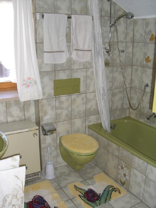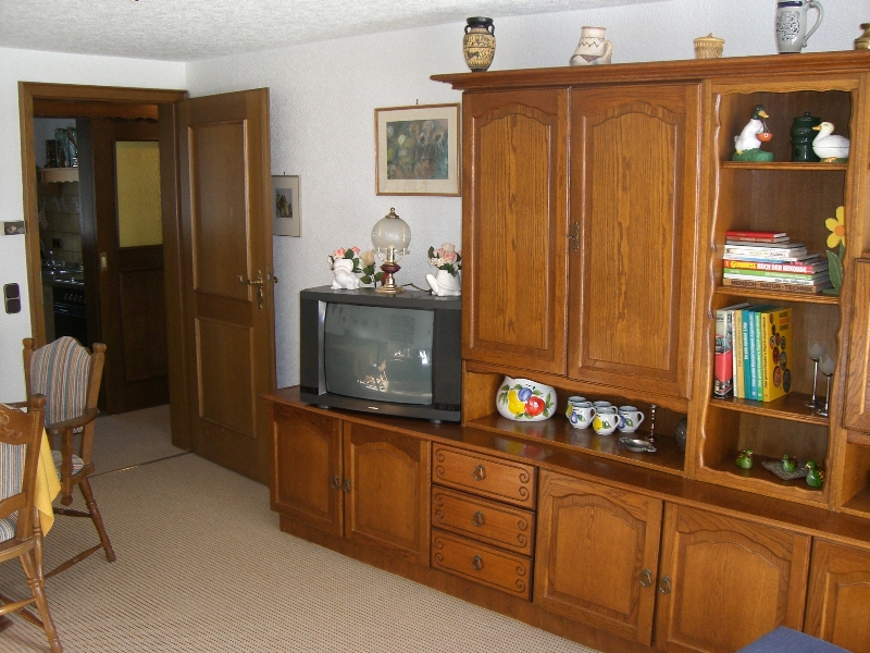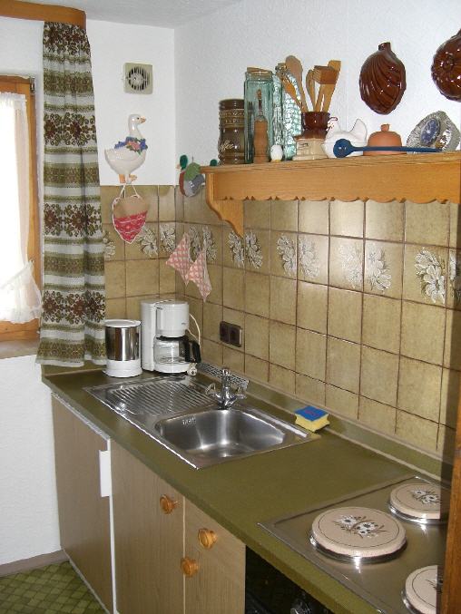 Hier sehen Sie die Küche mit 4-Plattenherd, Kühlschrank, Mikrowelle.... Natürlich ist auch Geschirr, Pfannen und Töpfe vorhanden.